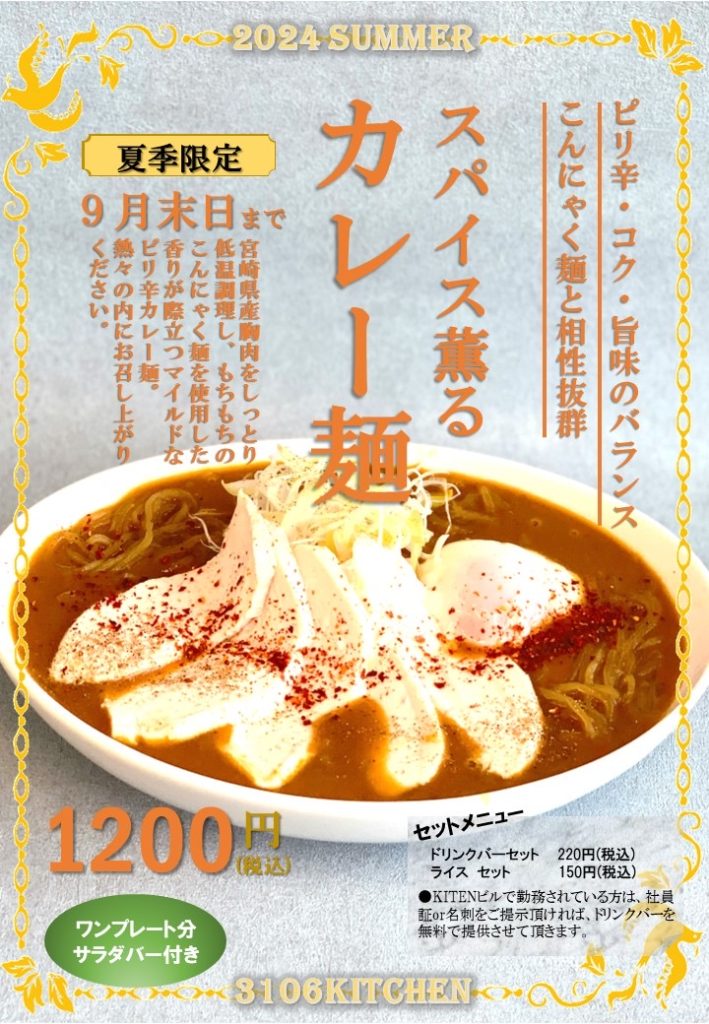 宮崎駅構内にありましたカレーのKUHで人気だったカレー麺を期間限定で提供しております。