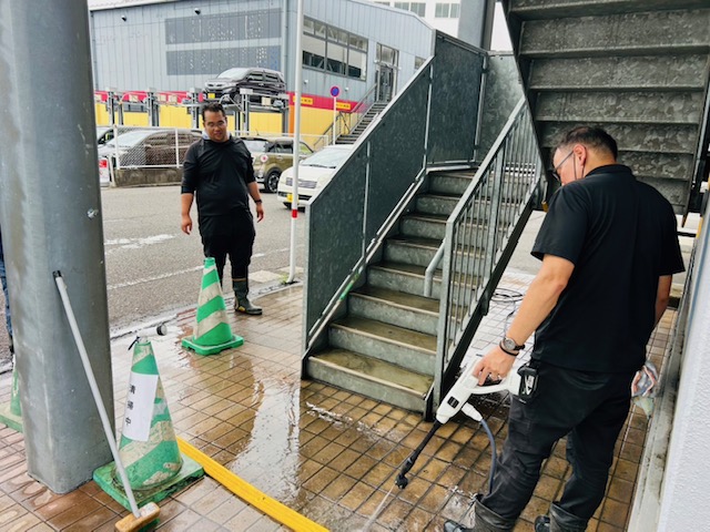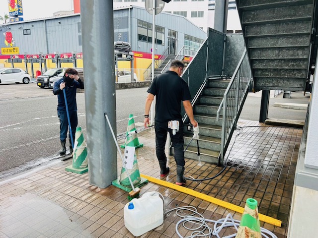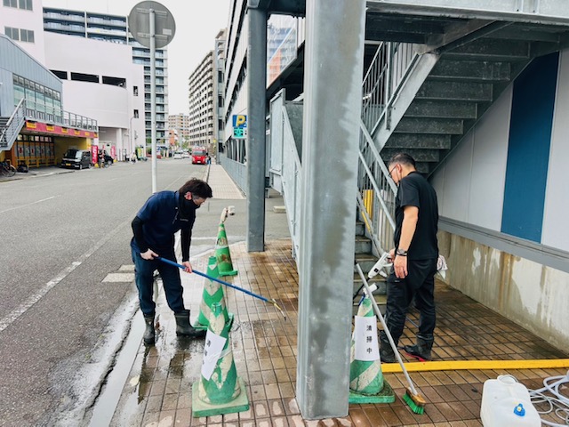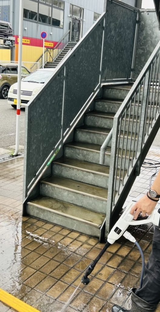 梅雨が明けて暑い夏がやって来た中、運送事業部の面々で三進パークの非常階段の清掃を行いました。